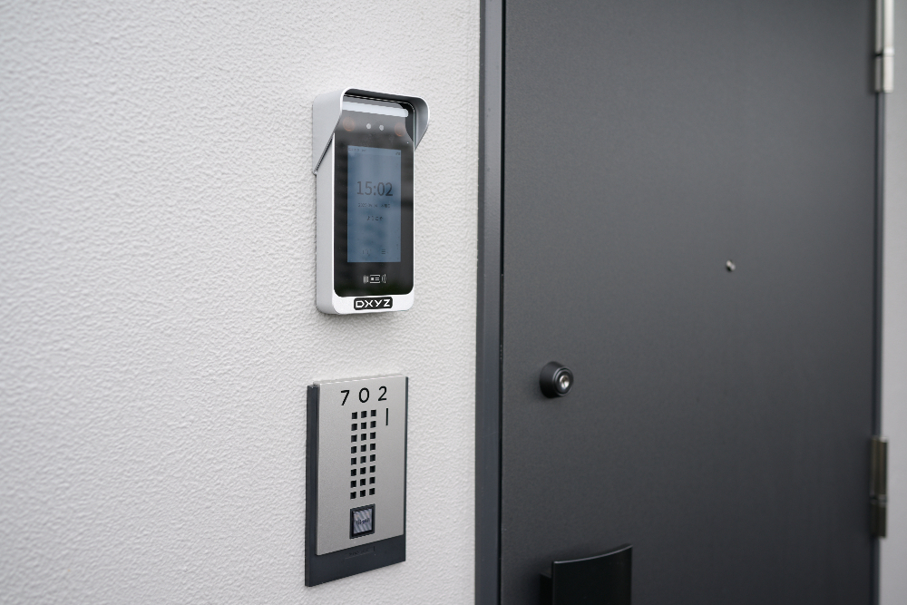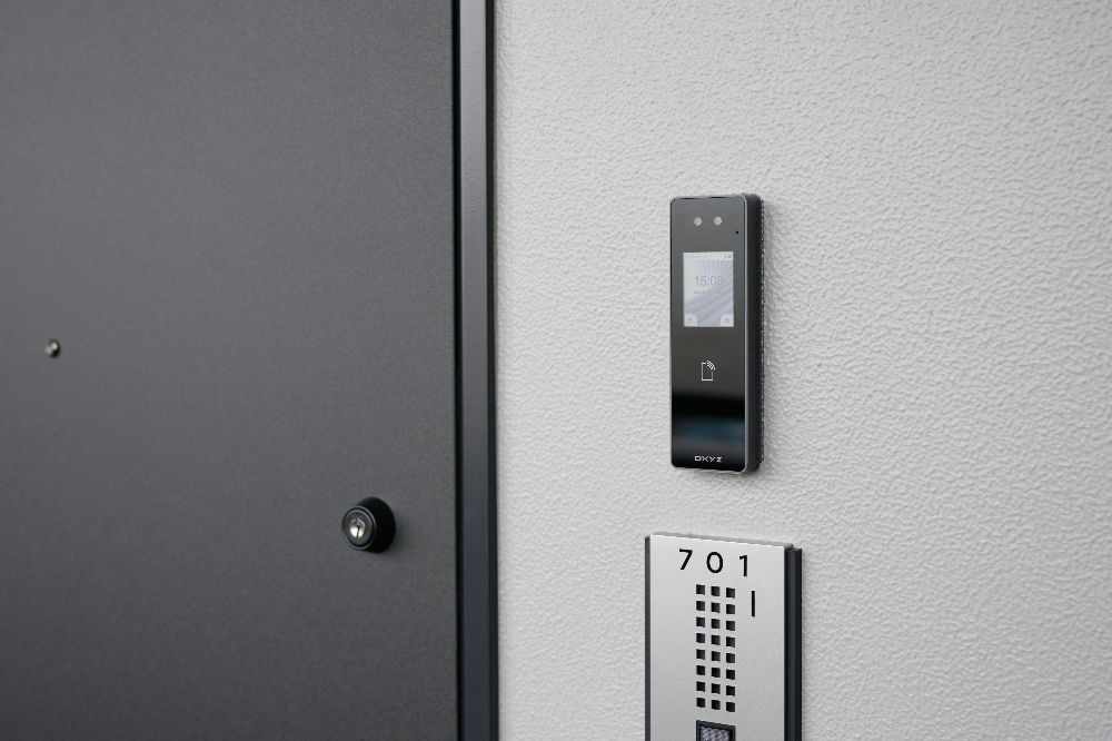 専有扉は、電気錠と連動している。顔認証端末を設置する箇所に応じて、屋外設置箇所には雨天対応の端末、それ以外の場所にはデザイン性の高い端末を設置して、機能性とデザイン性を両立した選択が可能。