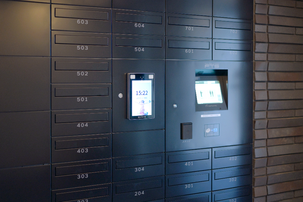 宅配/メールボックスとも連動している。部屋番号と顔認証が連動しているため、認証すると自動で扉が開く仕組みになっている。また、ボックスと顔認証端末が一体になっているので意匠性を確保しながら省スペースでの設置が可能となっている。