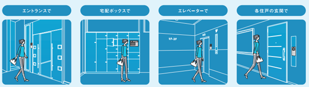 設置個所:エントランス、宅配/メールボックス、エレベーター、住戸扉、共用扉