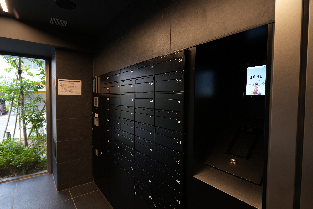 宅配/メールボックスは、部屋番号と顔認証が連動しているため、認証すると自動で扉が開く仕組みになっている。また、ボックスと顔認証端末が一体になっているので意匠性を確保しながら省スペースでの設置が可能となっている。