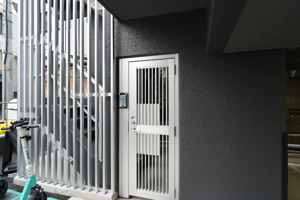 ピロティ出入り口は、シブタニの電気錠と連動して顔認証端末を設置。自転車置き場やモビリティ置き場を住民しか入れないセキュリティ区画にすることで、住民以外が自転車を停めないなど防犯や管理がしやすくなる運用が可能となる。