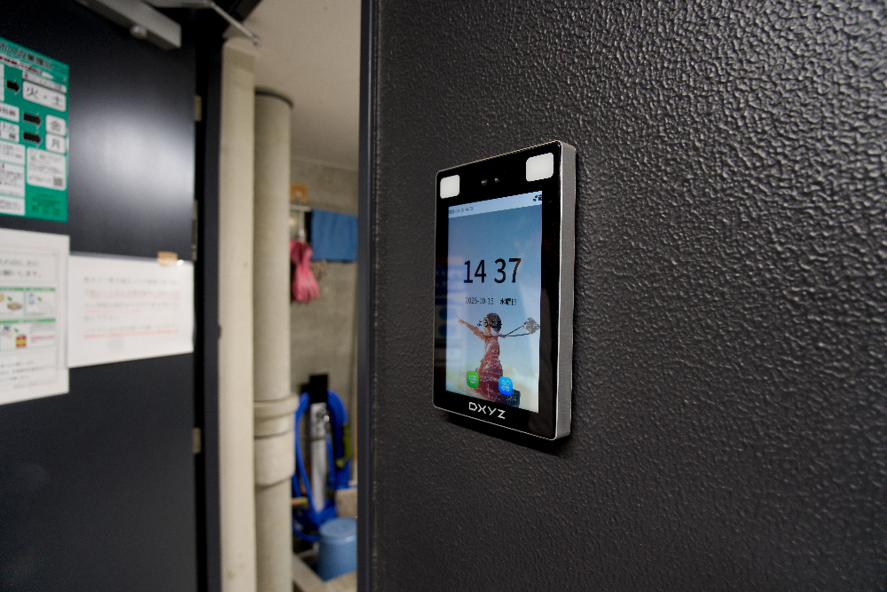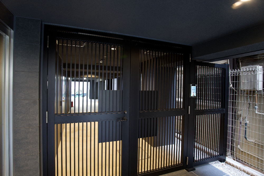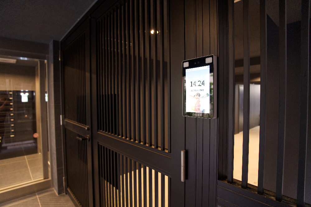 ピロティ出入り口は、シブタニの電気錠と連動して顔認証端末を設置。自転車置き場やモビリティ置き場を住民しか入れないセキュリティ区画にすることで、住民以外が自転車を停めないなど防犯や管理がしやすくなる運用が可能となる。