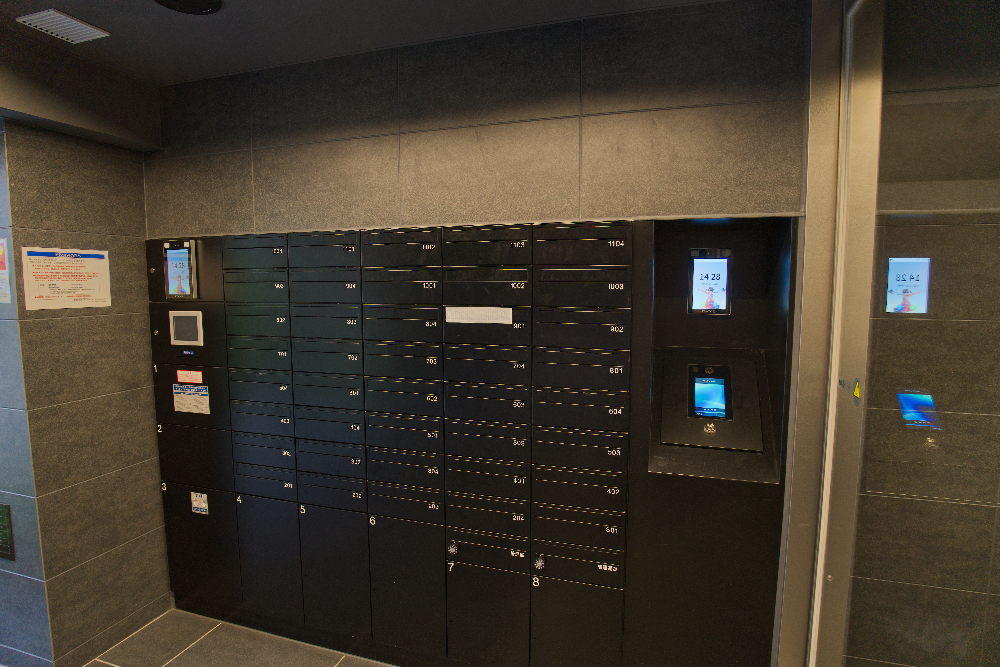 宅配/メールボックスは、部屋番号と顔認証が連動しているため、認証すると自動で扉が開く仕組みになっている。また、ボックスと顔認証端末が一体になっているので意匠性を確保しながら省スペースでの設置が可能となっている。