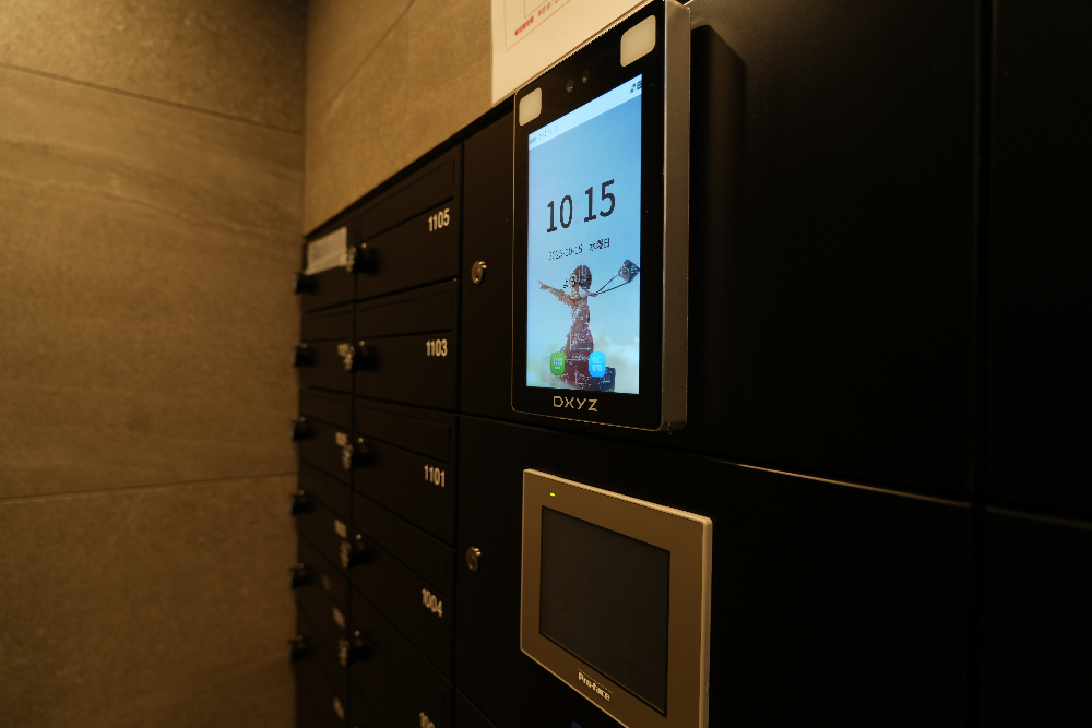 宅配/メールボックスは、部屋番号と顔認証が連動しているため、認証すると自動で扉が開く仕組みになっている。また、ボックスと顔認証端末が一体になっているので意匠性を確保しながら省スペースでの設置が可能となっている。