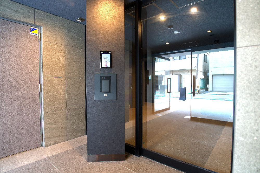 エントランスに設置された顔認証端末。