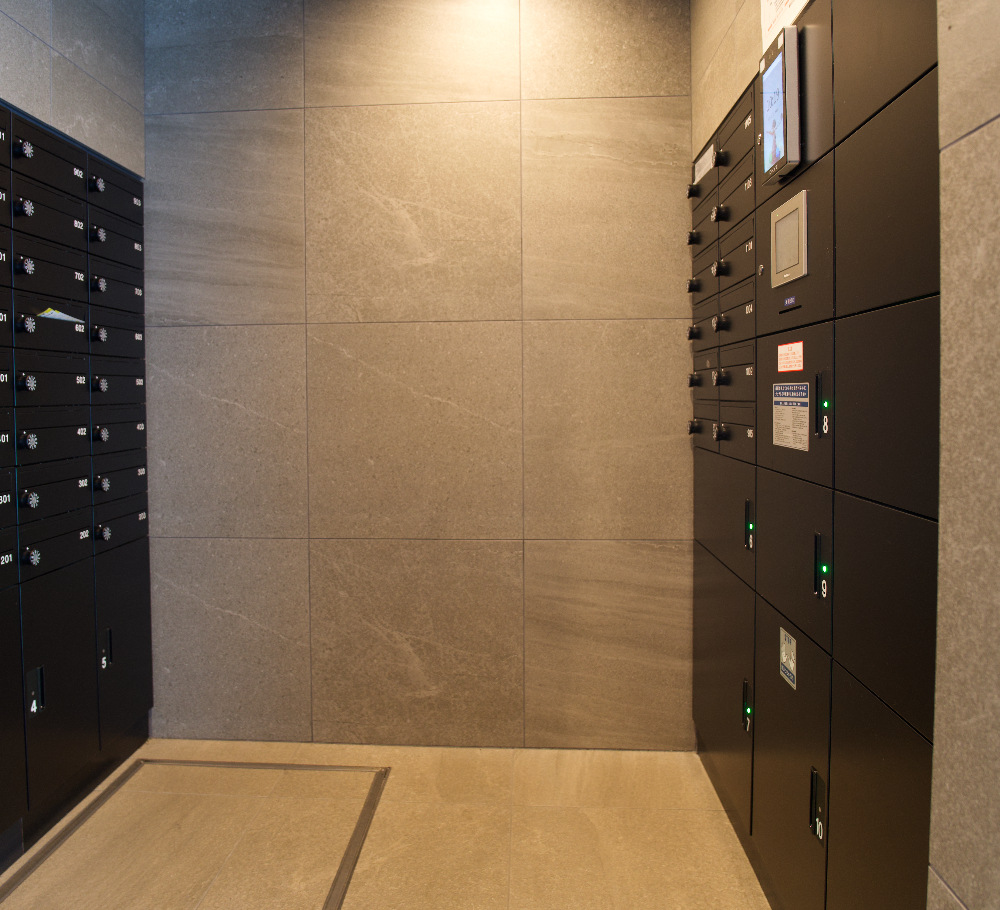宅配/メールボックスは、部屋番号と顔認証が連動しているため、認証すると自動で扉が開く仕組みになっている。また、ボックスと顔認証端末が一体になっているので意匠性を確保しながら省スペースでの設置が可能となっている。