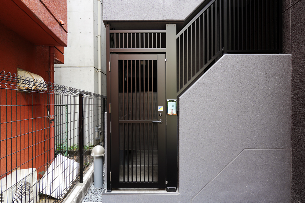 屋外階段もシブタニの電気錠と連動している。防塵防滴に対応した端末を選択することで、雨ざらしの環境下でも設置が可能となっている。