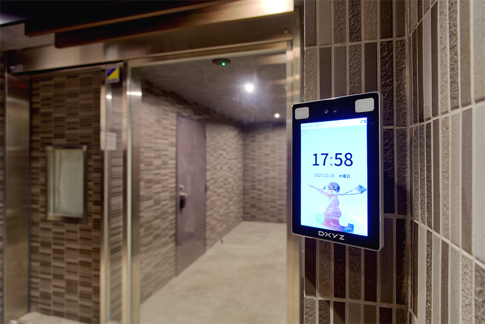 エントランスに設置された顔認証端末。