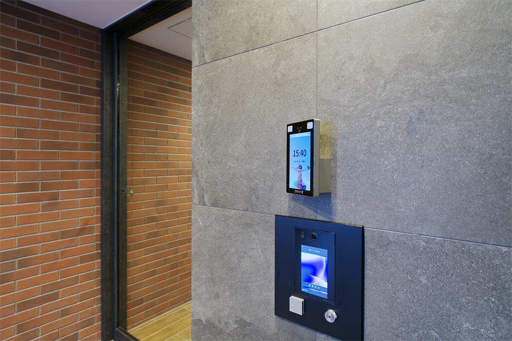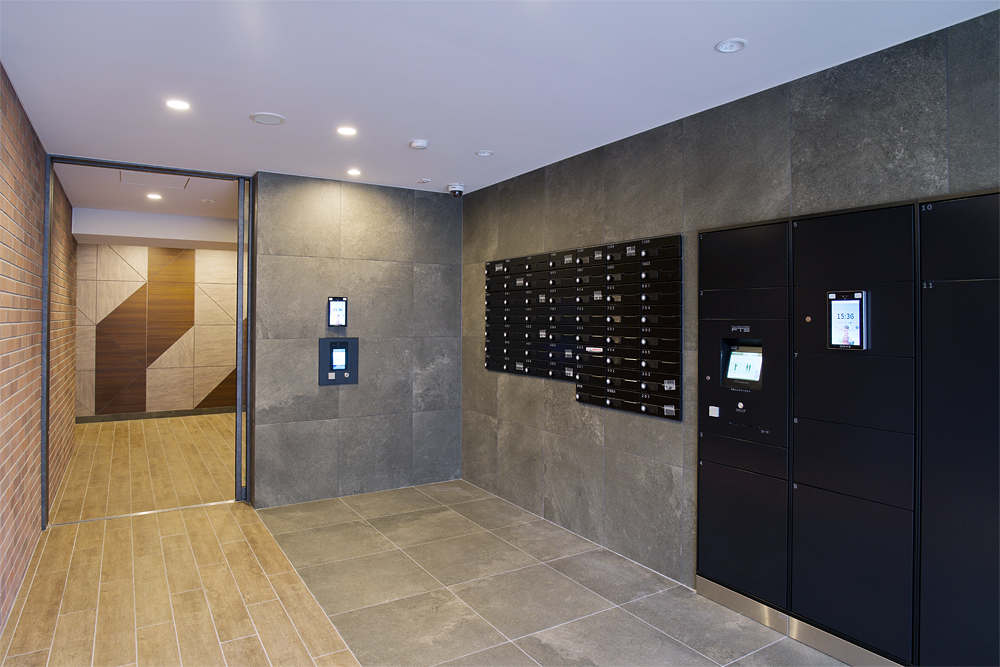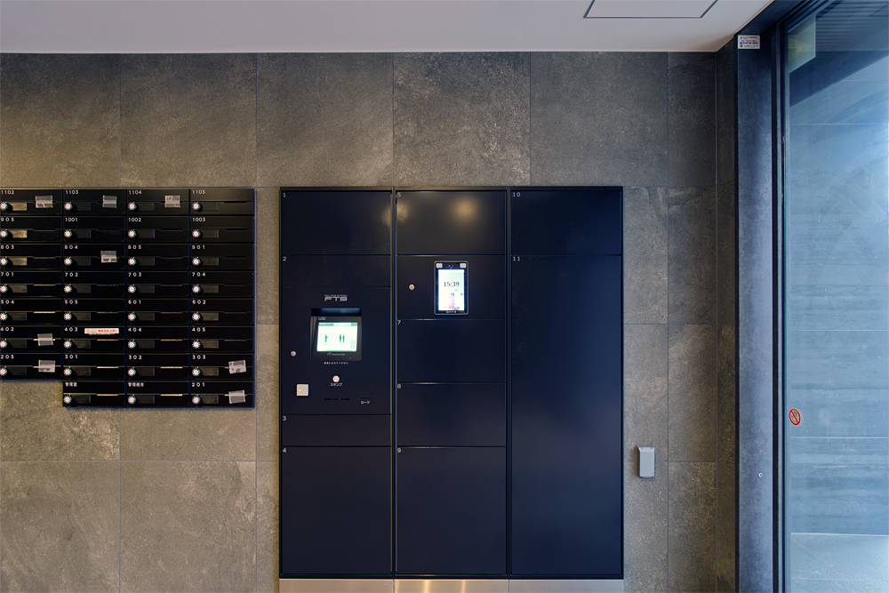 フルタイムシステムの宅配ボックスと連動している。部屋番号と顔認証が連動しているため、認証すると自動で扉が開く仕組みになっている。また、ボックスと顔認証端末が一体になっているので意匠性を確保しながら省スペースでの設置が可能となっている。