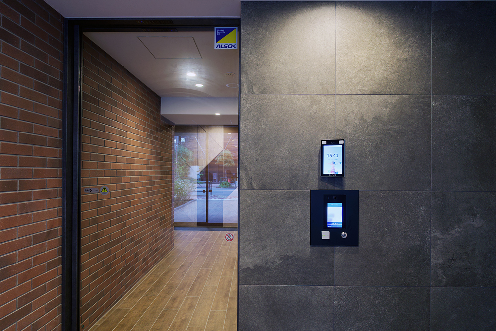 エントランスに設置された顔認証端末。