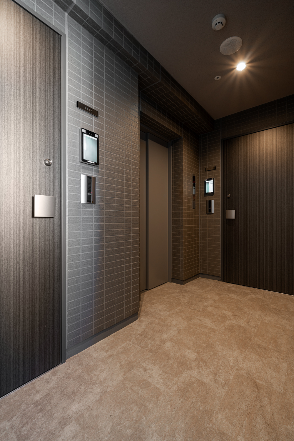 エレベーターと連動し、エントランスで認証すると1階にエレベーターが着床する仕様になっており、エントランスからエレベーターまでのウォークスルーを実現している。エレベーターのドアは、顔認証をしないと開かない仕組みなので、セキュリティ性と利便性を両立している。