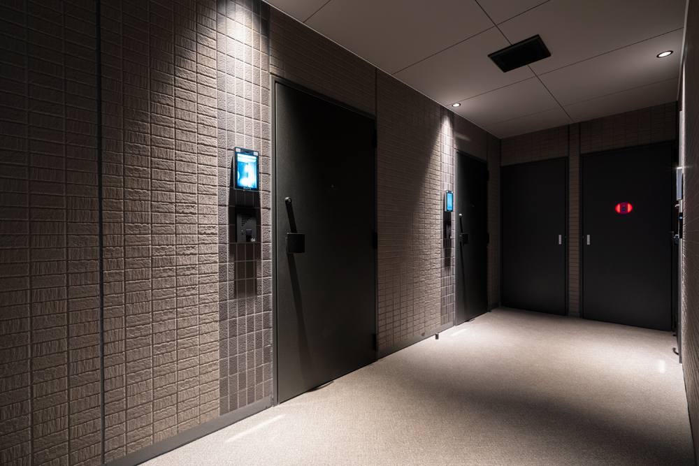 宅配/メールボックスとも連動している。部屋番号と顔認証が連動しているため、認証すると自動で扉が開く仕組みになっている。 また、エレベーターと連動し、エントランスで認証すると1階にエレベーターが着床する仕様になっており、エントランスからエレベーターまでのウォークスルーを実現している。エレベーターのドアは、顔認証をしないと開かない仕組みなので、セキュリティ性と利便性を両立している。