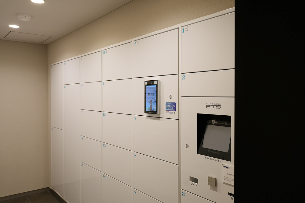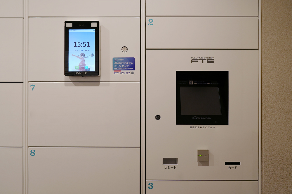 宅配ボックスに設置された顔認証端末。フルタイムシステムと連動している。部屋番号と顔情報が紐づいているため、顔をかざすだけでボックスが開くため入居者にとって煩わしい操作が必要なく利便性を高めている。