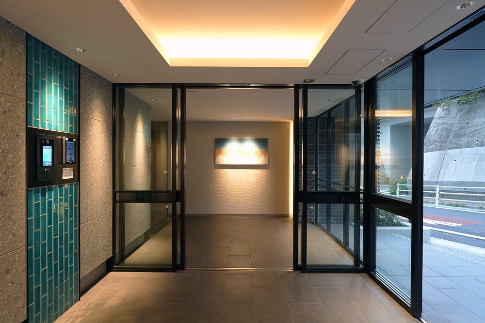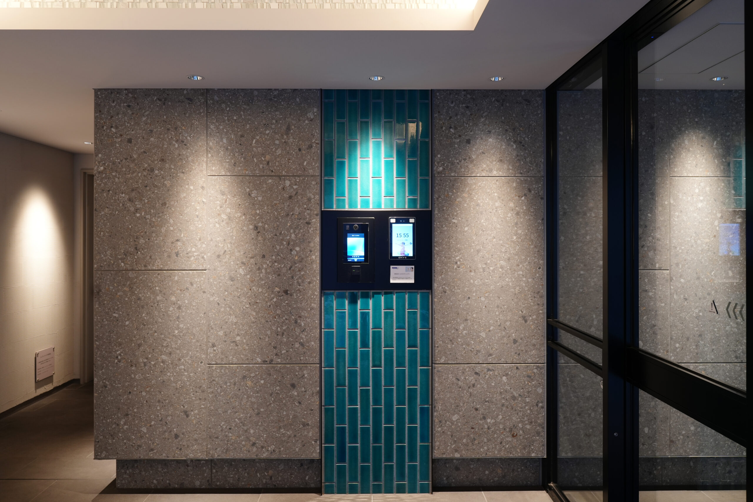 エントランスに設置された顔認証端末。カバンから鍵を探すことなく、認証することで自動ドアを開けることが可能になっている。