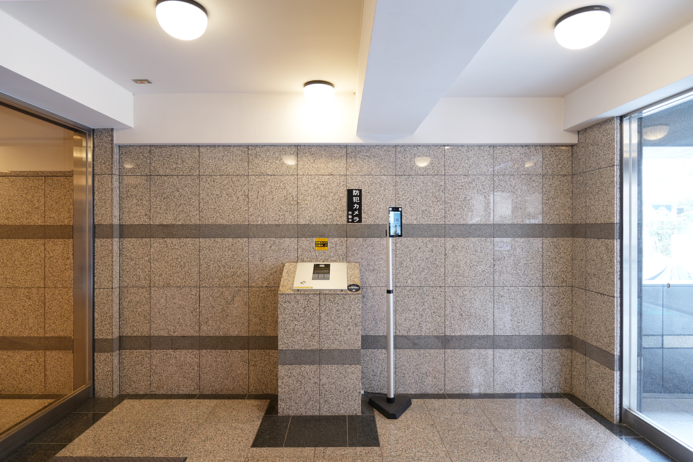 エントランスに設置された顔認証端末。既存マンションに後付けしたため、スタンドを取り付けて設置している。