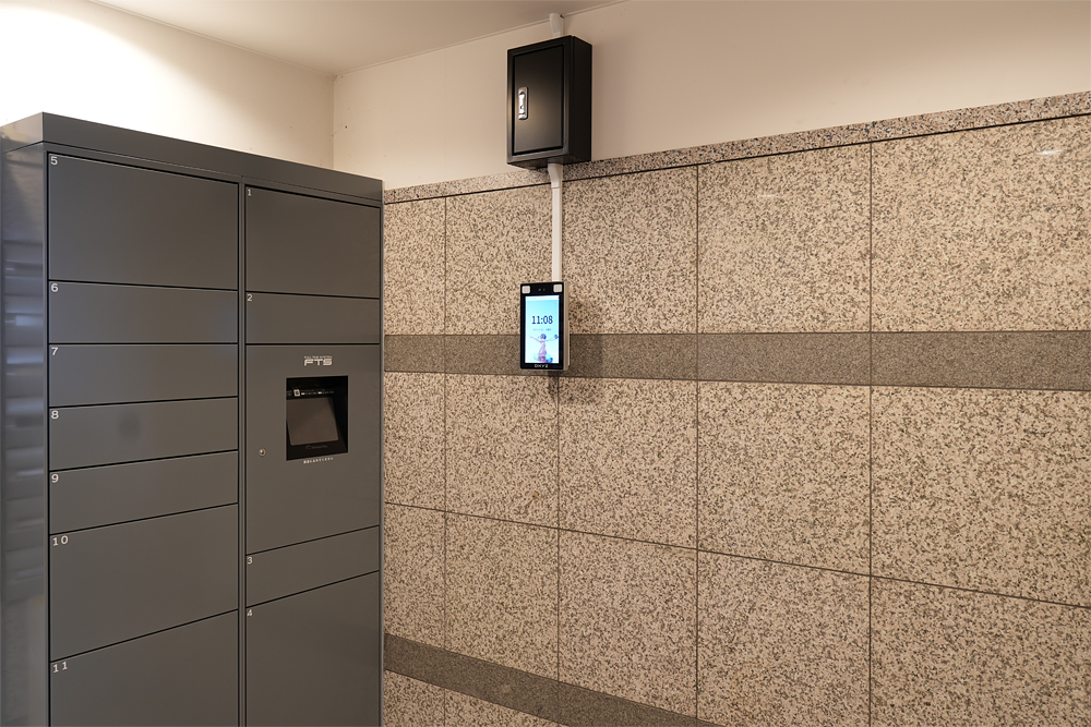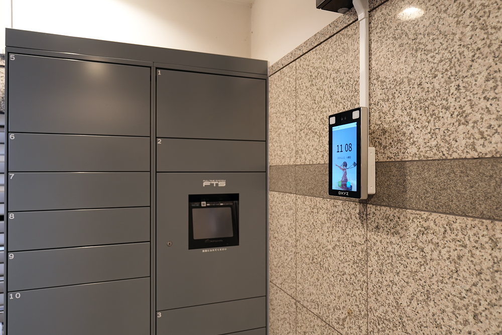 宅配ボックスは、フルタイムシステムと連動している。既存マンションだったことから、配線やアダプターなどの資材がきれいに収まる工夫をしている。 部屋番号と顔情報が紐づいているので、顔をかざすだけで荷物の受け取りが可能となっている。