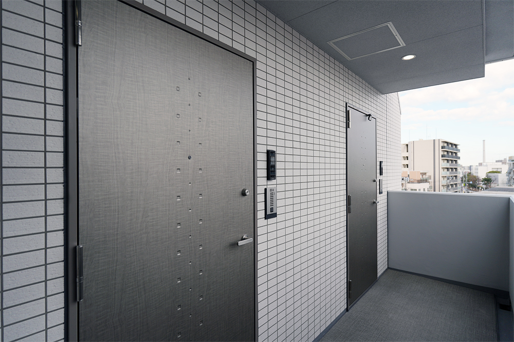 住戸扉は、美和ロックと連動している。雨などが入る屋外廊下でも機能と意匠性を確保できる端末を採用している。スタイリッシュさと高いセキュリティ性と利便性を考慮した選択が可能となっている。