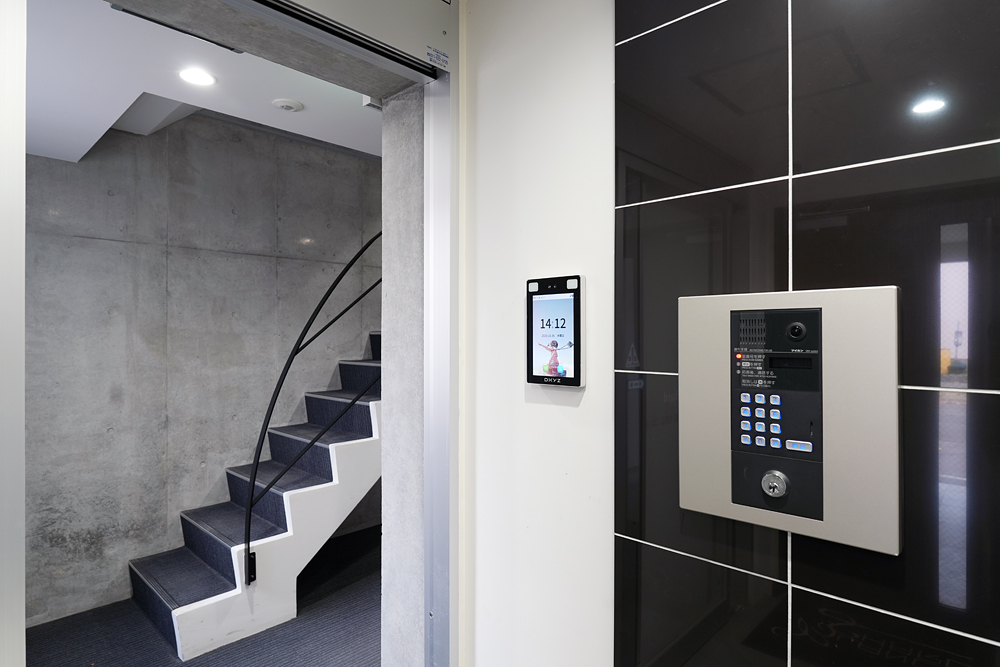 エントランスに設置された顔認証端末。