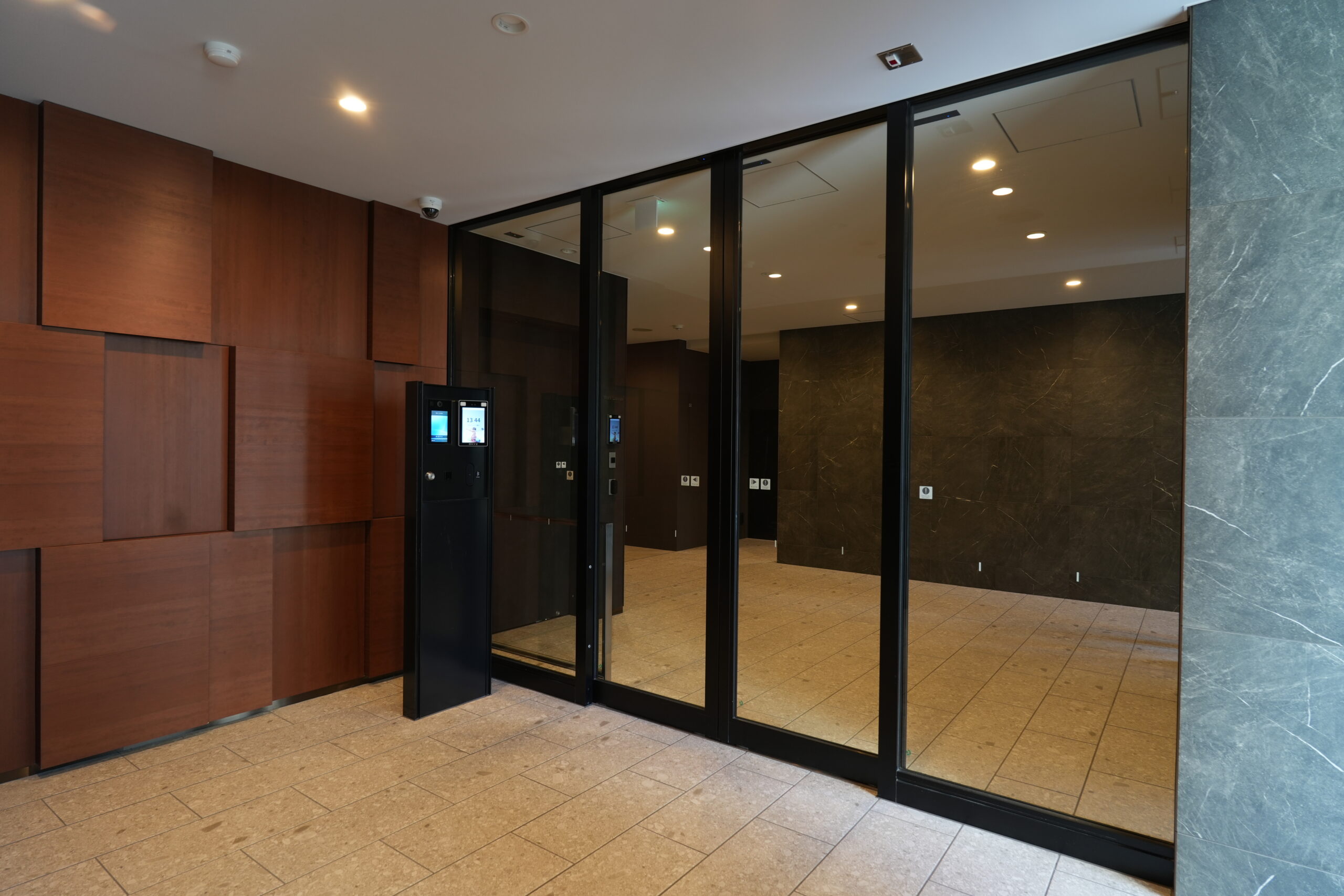 エントランスに設置された顔認証端末。化粧柱を設置することで、角度をつけて端末を設置することができ、認証時に端末へ顔を向ける必要がなくなり、自然な歩き方で入館できる。