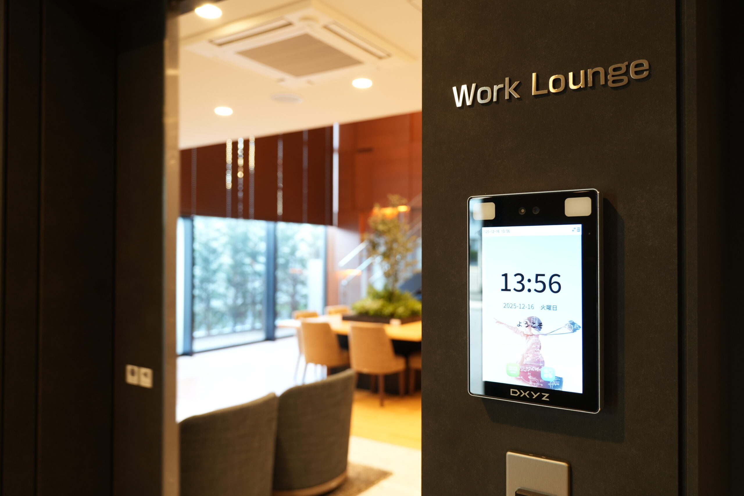 ワークラウンジのエントランス側に設置された顔認証端末。顔認証を設置することで入居者しか利用できない区画にできる。