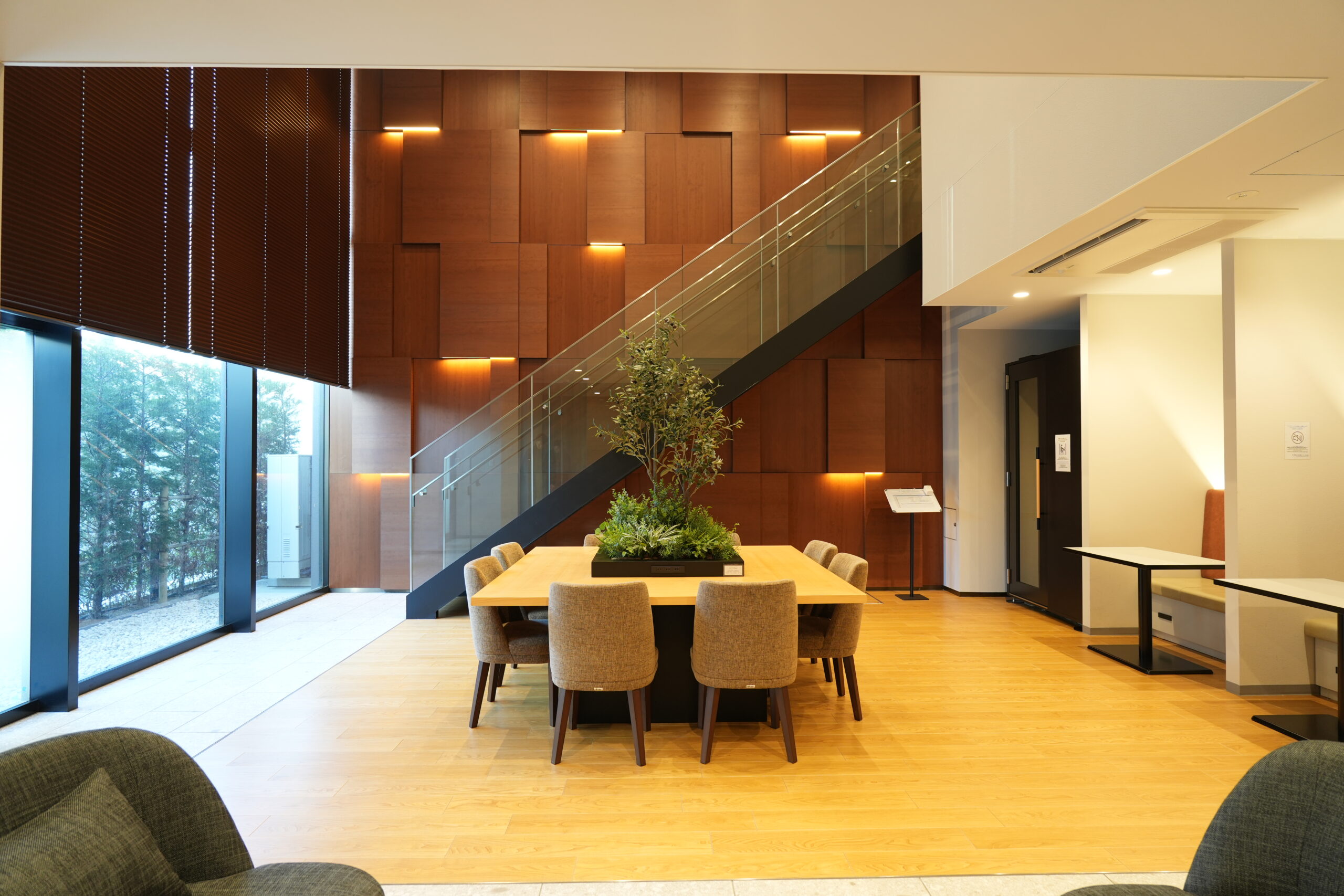 壁面や床とセンターテーブルに国産天然木を使用してバイオフィリックを目指した共用部になっています。また、働き方の多様性に配慮してリモートワークができる2層吹抜のマルチラウンジを設置しています。オンライン会議にも対応できる個室ブースや無人コンビニの「TUKTUK」も設けました。