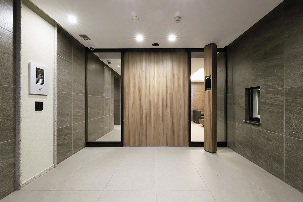 エントランスに設置された顔認証端末。化粧柱を立て角度をつけて顔認証端末を設置することで、認証時に顔を向ける必要がなくなる。端末の認証速度が速いため、歩きながらの認証が可能となっている。鍵を探したり、鍵をかざす必要がなくなるため入居者の利便性が高くなっている。